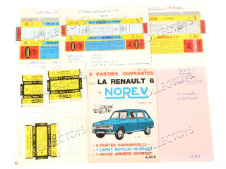 ce lot est une parfaite illustration de la façon dont le service communication travaillait pour la commande et réalisation de boites - il comprend : une série de 6 boites de RENAULT 6 toutes différentes qui sont agrafées sur des bristols avec pour titre 'de 1 à 6e série - Renault 16' - sous les boites on trouve les inscriptions suivantes : 'fournisseur : BRICOUT, commande : ..., reçu : ... - prix : ... F le % + ... frais création - 2% escompte', une fiche technique pour la conception d'une boite avec les caractéristiques & une affiche publicitaire en édition originale provenant du classeur du service communication avec la date manuscrite MAI 1969 - cet ensemble était dans différents classeurs avec l'ensemble des boite produites par la marque ainsi que les fiches techniques et permettait au service d'avoir une trace de ses commandes et fabrications - DOSSIER TRES INTERRESSANT !