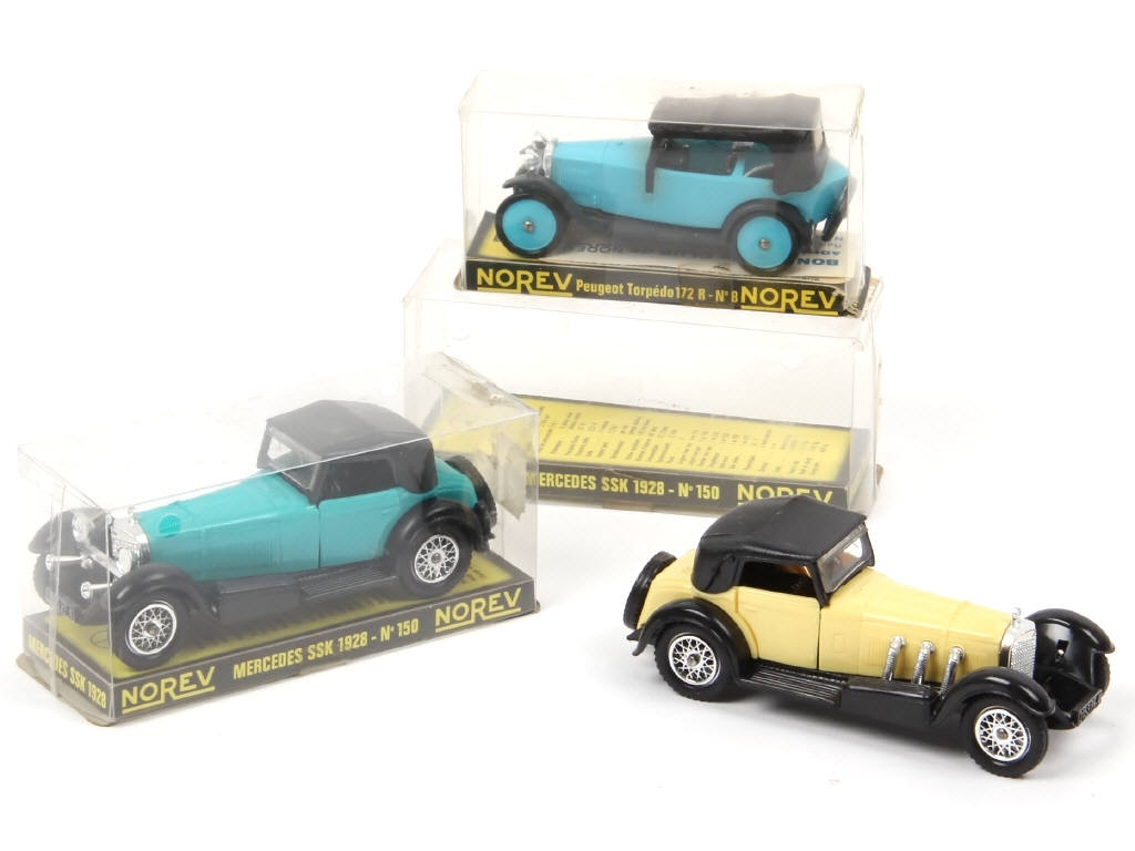 comprend : MERCEDES SSK (2 couleurs différentes dont une avec phares manquants) & PEUGEOT TORPEDO 172R - quelques accrocs & déformations sur les boites