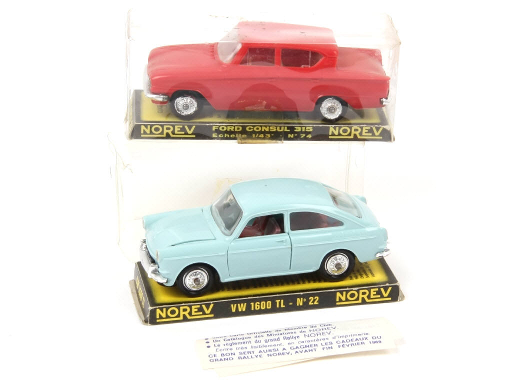 comprend : FORD CONSUL (vitrage opacifié, jantes plus ou moins fondues) & VOLKSWAGEN 1600 - avec un bon d'inscription au club NOREV - quelques accrocs & déformations sur les boites