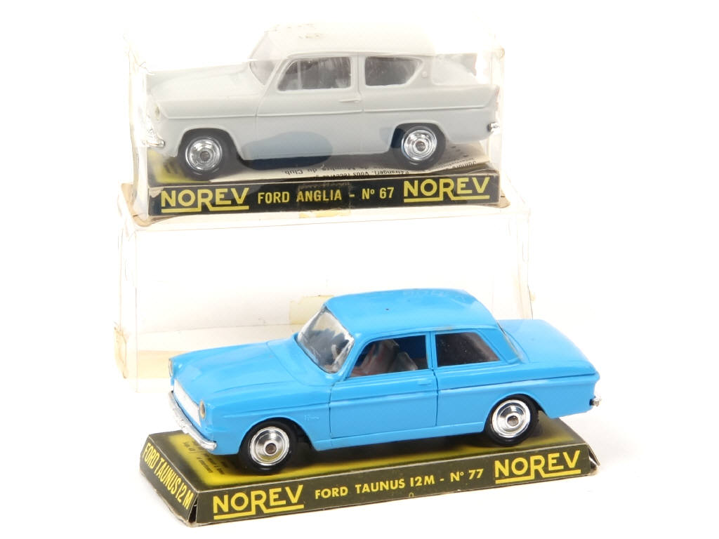 comprend : TAUNUS 12M (boite en état 'c') & ANGLIA (boite en état 'b') - vitrages plus ou moins opacifiés - avec bons d'inscription au club NOREV - quelques accrocs & déformations sur les boites