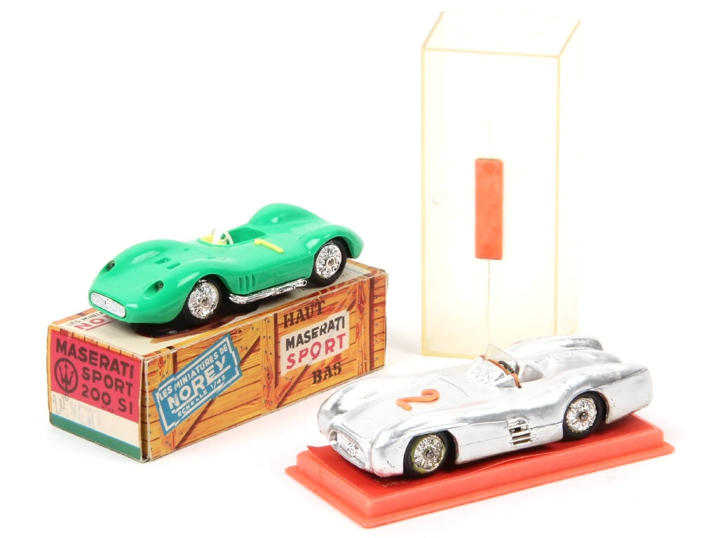 comprend : MASERATI SPORT 200 SI en état 'A.b' (avec tampon 'VERT' sur un rabat de boite (quelques frottements & accrocs) & MERCEDES de compétition (réservée aux gagnants du jeu RALLYE NOREV, état 'C.c', fêlure sur le couvercle de boite)