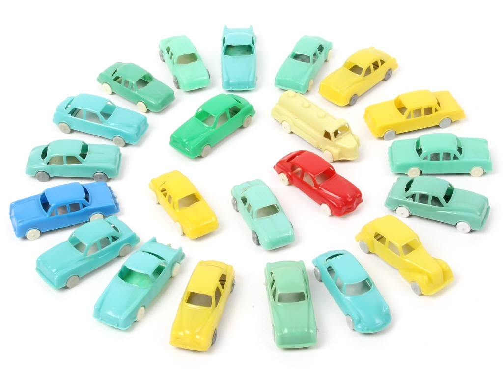 petite échelle - miniatures reproduisant les modèles : CITROËN, PEUGEOT, BERLIET, RENAULT & SIMCA - certains planchers avec marquage TROPICA - très légères traces de colle d'origine par endroits
