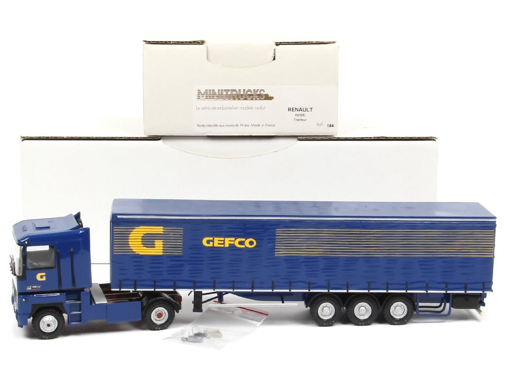 MINITRUCKS (FRANCE) 144A/145 RENAULT AE 500 Intercooler semi-remorque fourgon à rideaux latéraux TRAILOR 'GEFCO' bleu & jaune