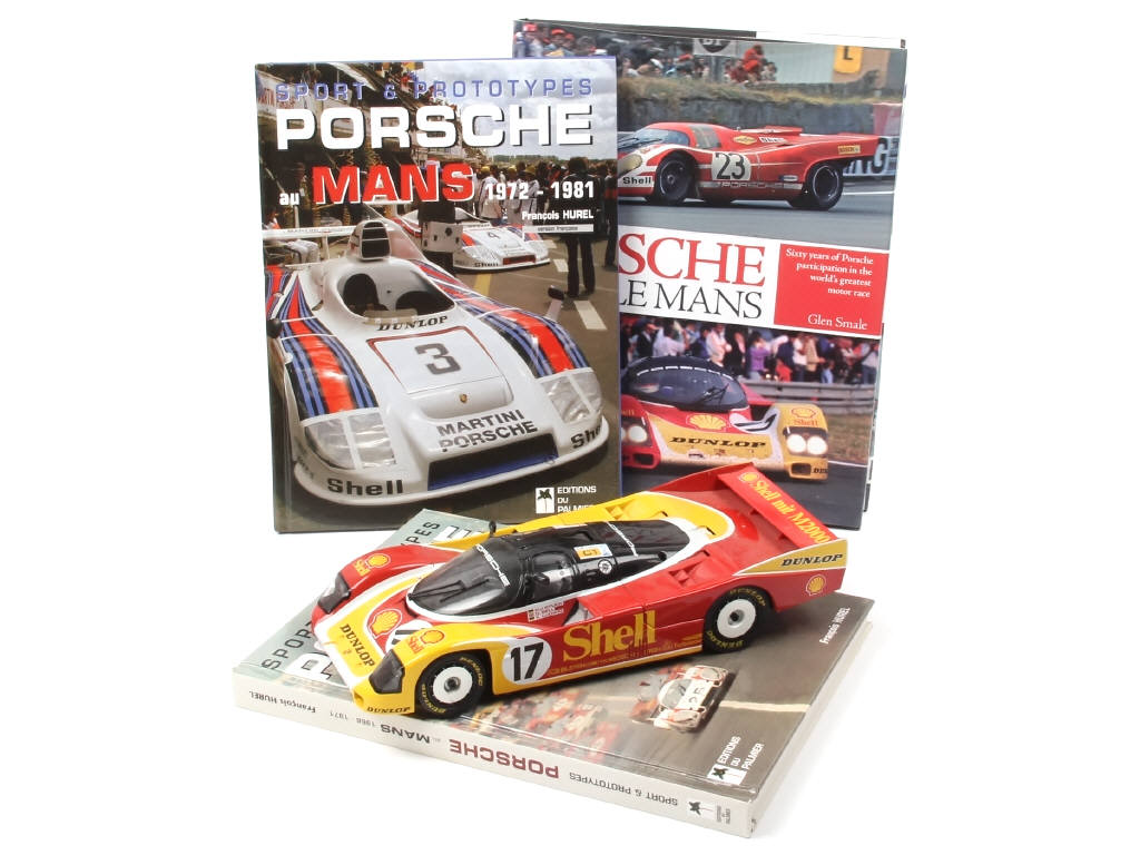 échelle 1/18ème - modèle transformé (carrosserie légèrement encrassée) - on y joint 3 ouvrages se rapportant à la marque PORSCHE & à la célèbre course (différentes langues)