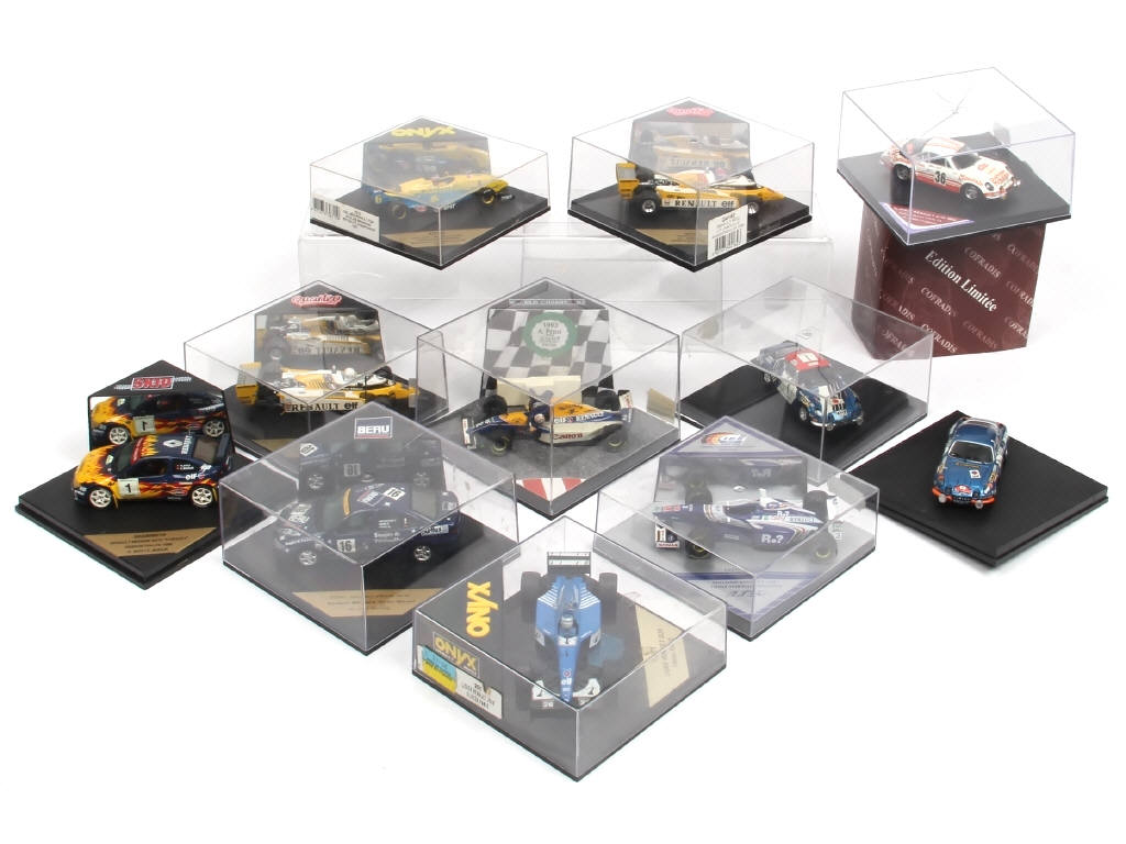 comprend notamment : LIGIER, RENAULT & WILLIAMS - on y retrouve notamment les marques : TROFEU, ONYX, VITESSE & QUARTZO - plusieurs modèles en série limitée - petits manques & parties cassées sur certains exemplaires - quelques boites avec fêlures & encrassement