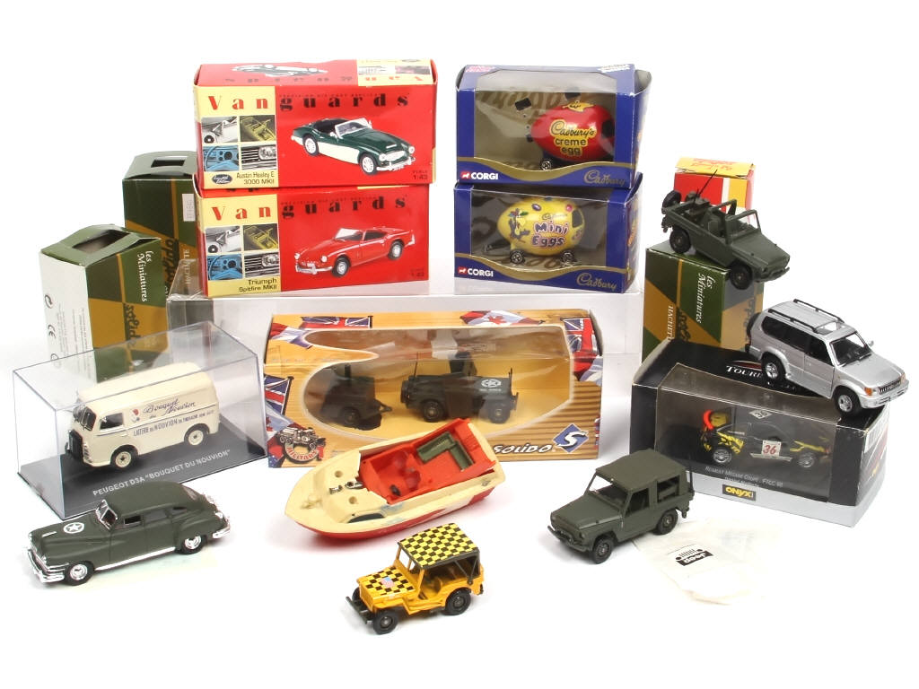 comprend notamment les modèles : PEUGEOT, CHRYSLER, JEEP, TOYOTA & AUSTIN HEALEY - on y retrouve notamment les marques : VANGUARDS, SOLIDO, CORGI, EDITIONS HACHETTE & ONYX - avec manques & parties cassées - boites en états 'b' à 'd' - 2 modèles sans