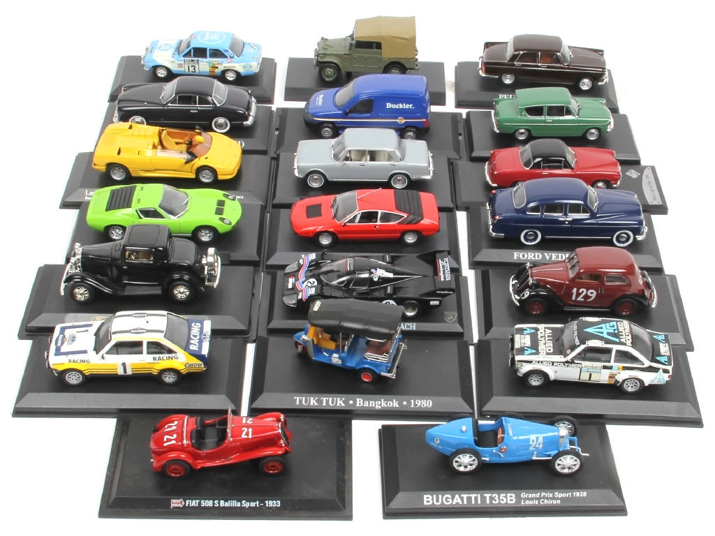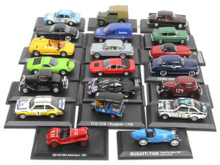 modèles pour la plupart vendus en kiosque - comprend les modèles : FORD, LAMBORGHINI, PEUGEOT, FIAT & CITROEN - on y retrouve notamment les marques : SPARK & ALTAYA - possibilité de quelques petits éléments cassés & manquants - carrosseries poussièreuses