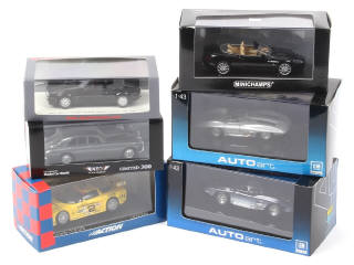miniatures reproduisant les modèles : ASTON MARTIN (2 exemplaires différents), CHEVROLET (3 exemplaires différents dont un avec rétroviseurs à positionner) & BRISTOL - on y retrouve les marques : AUTO ART, NEO, ACTION & SPARK - manques quelques vis de fixation de socle