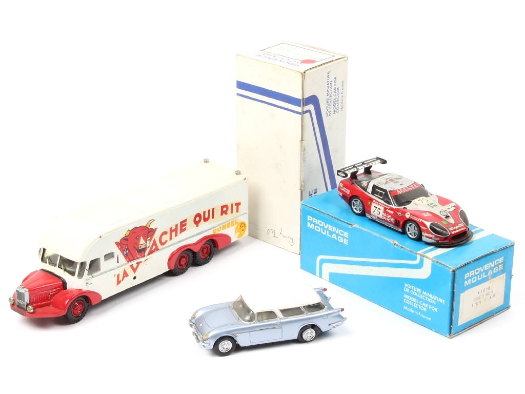 miniatures reproduisant les modèles : BERNARD (état 'B', décalques incomplets, sans boîte) & CHEVROLET (2 exemplaires différents dont un avec 3 pneus coupés & un autre Le Mans) - on y retrouve les marques MINITRUCK & PROVENCE MOULAGE - quelques accessoires cassés & manquants