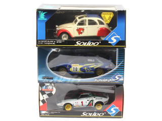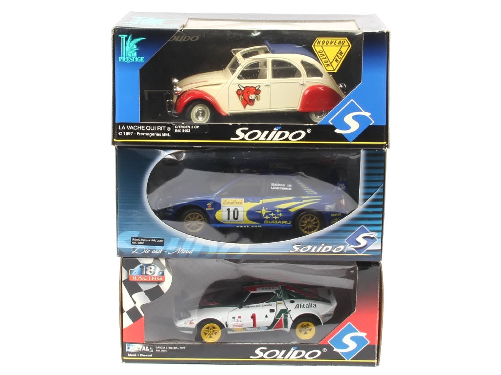échelle 1/18ème - comprend les modèles : CITROËN 2CV 'LA VACHE QUI RIT', SUBARU IMPREZA WRC & LANCIA STRATOS (protection de phares à repositionner) - quelques accrocs sur les boîtes