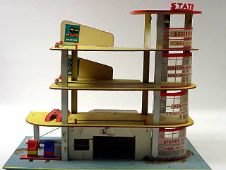 dimensions : 49 x 30 x 40 cm - avec 1 pont élévateur & 2 pompes à essence - publicités 'MARCHAL & CIBIE' - quelques manques - idéal pour présenter vos modèles sans boîte