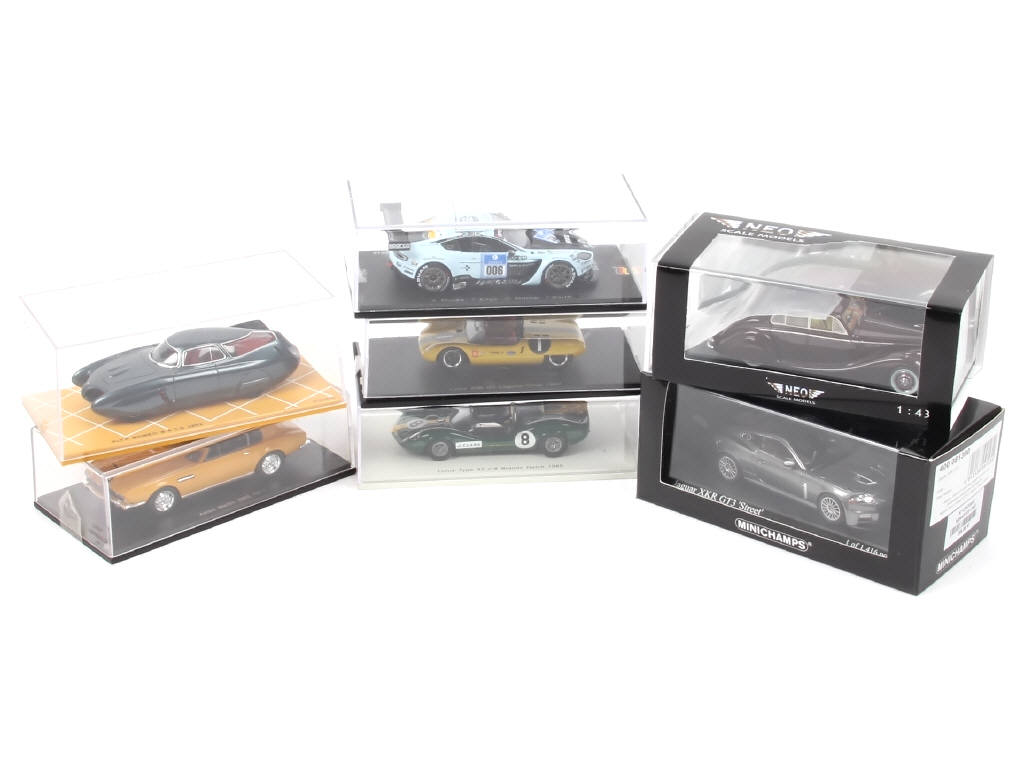 miniatures reproduisant les modèles : LOTUS (2 exemplaires différents), ASTON MARTIN (2 exemplaires dont un en série limitée), ALFA ROMEO & JAGUAR (2 exemplaires différents dont un avec rétroviseurs cassés) - on y retrouve les marques : MINICHAMPS, BIZARRE, NEO & SPARK - manque 5 suremballages