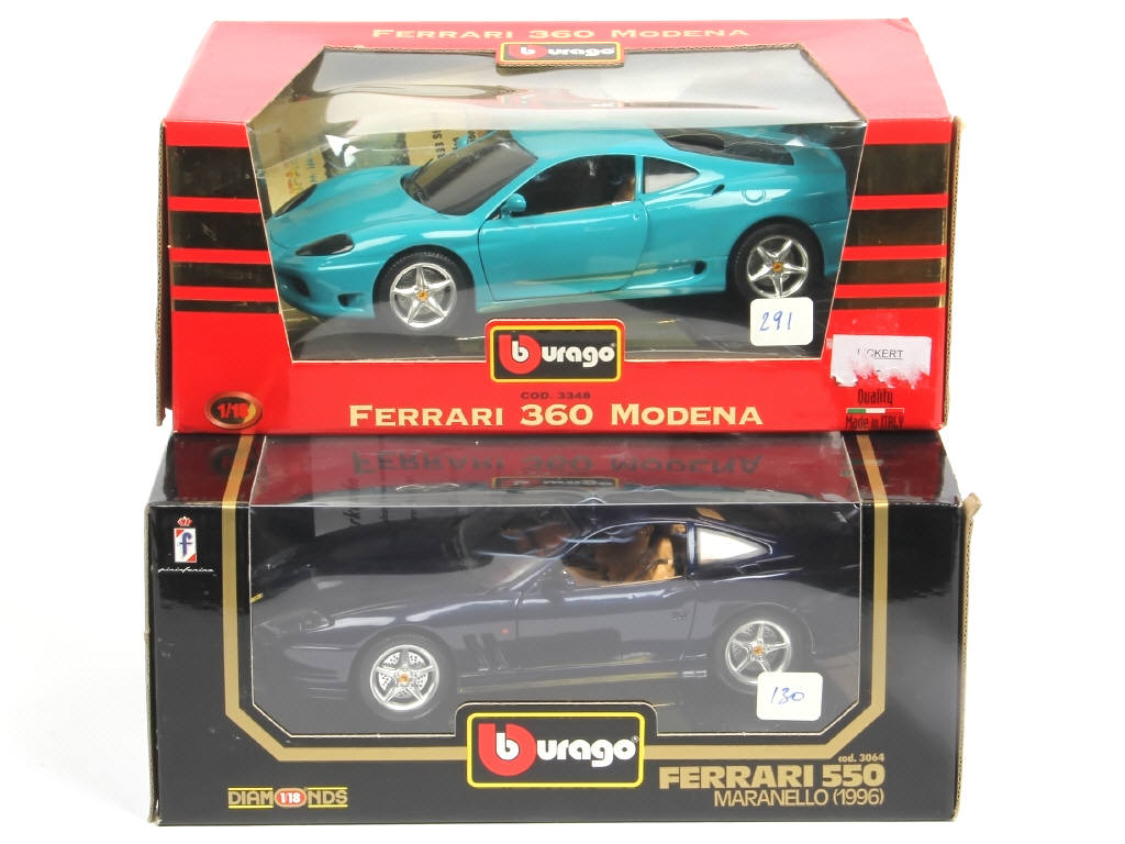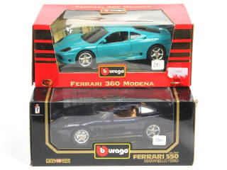échelle 1/18ème - comprend : 360 MODENA 1999 (avec certificat d'édition limitée numéroté 104/333 exemplaires - une légère rayure sur le pare-brise) & 550 MARANELLO 1996 (avec certificat d'authenticité) - blisters de boite plus ou moins abîmés - étiquettes sur la boite