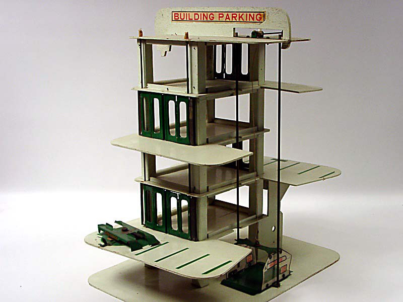 dimensions : 41 x 30 x 47 cm - avec un ascenceur, un pont élévateur & un système de portes ouvrantes - légère oxydation sur les parties nickelées - quelques manques