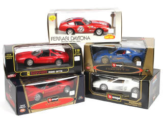 échelle 1/18ème - comprend les modèles : 328 GTS, GTO 1984, DAYTONA 365 GTB/4, F40 & TESTAROSSA - on y retrouve les marques : BBURAGO, ANSO & GIODI - quelques accrocs sur les boites