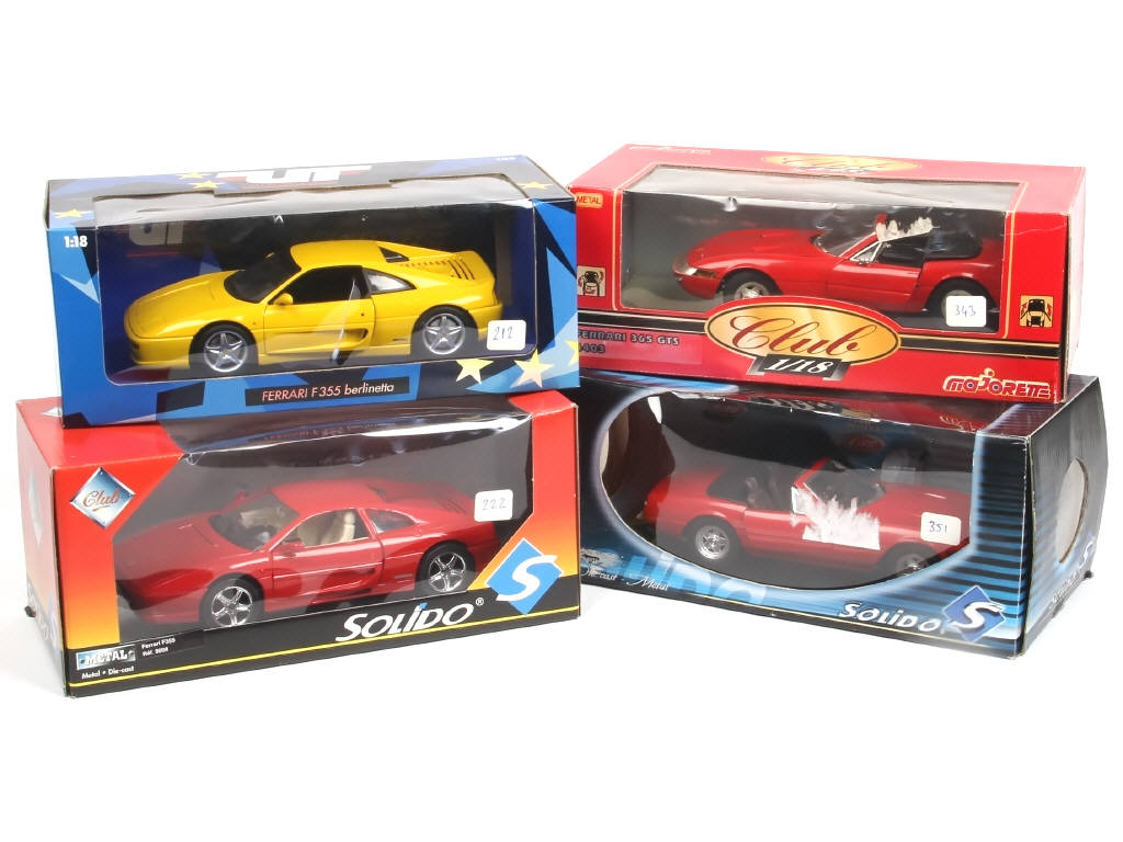 échelle 1/18ème - comprend les modèles : F355, BERLINETTA & 365 GTS - on y retrouve les marques : MAJORETTE, UT MODELS & SOLIDO - quelques accrocs sur les boites (état 'b')