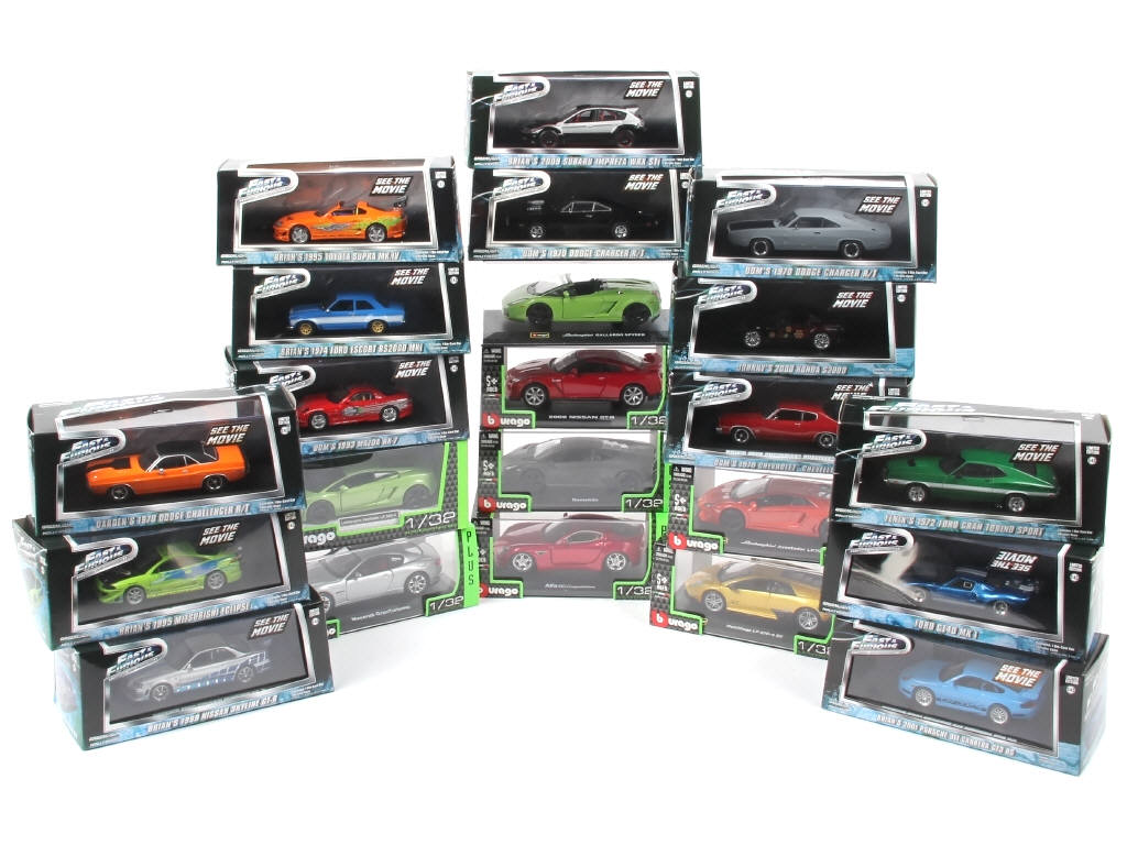 échelles 1/32ème & 1/43ème - miniatures reproduisant notamment les modèles : LAMBORGHINI, MASERATI, SUBARU & ALFA ROMEO - on y retrouve les marques : BBURAGO & GREEN LIGHT (modèles tirés de la série FAST & FURIOUS)
