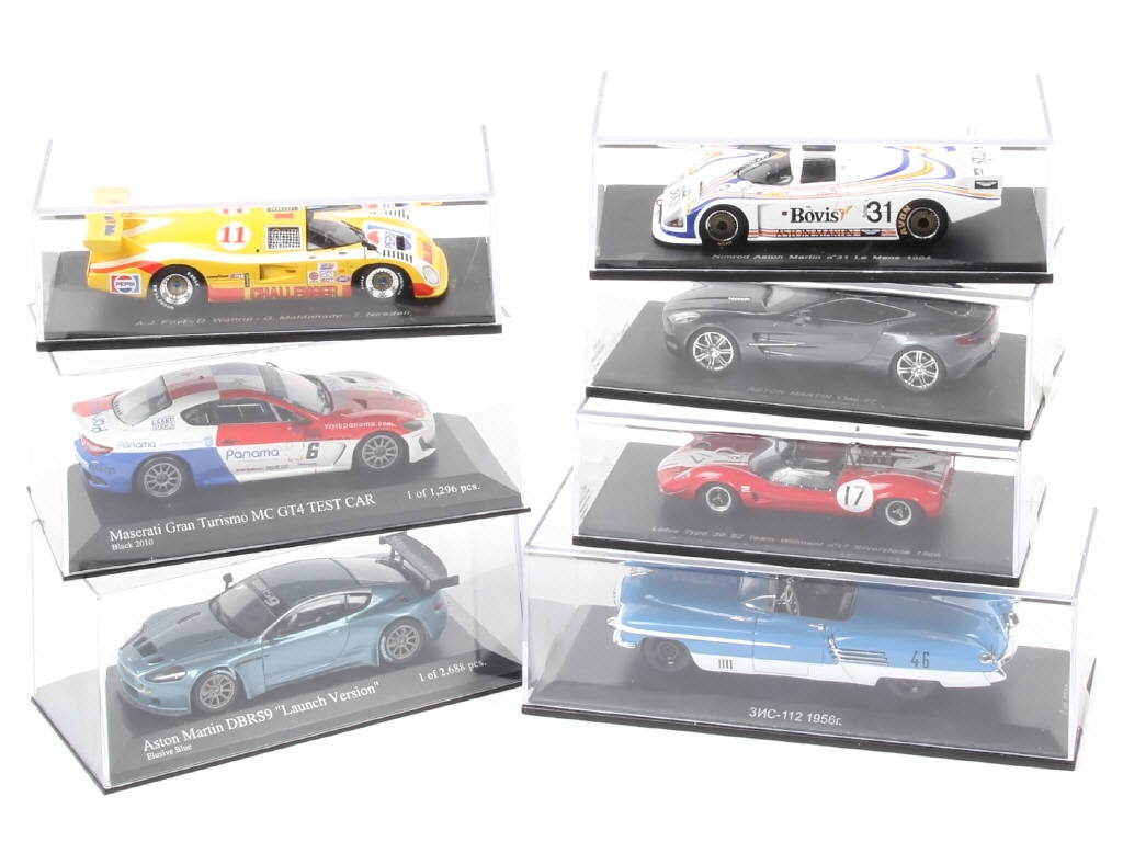 miniatures reproduisant notamment les modèles : LOTUS, ASTON MARTIN (4 exemplaires différents) & MASERATI - on y retrouve les marques : MINICHAMPS, SPARK & DIP (série limitée) - manque une fixation de socle de boîte - manque suremballages