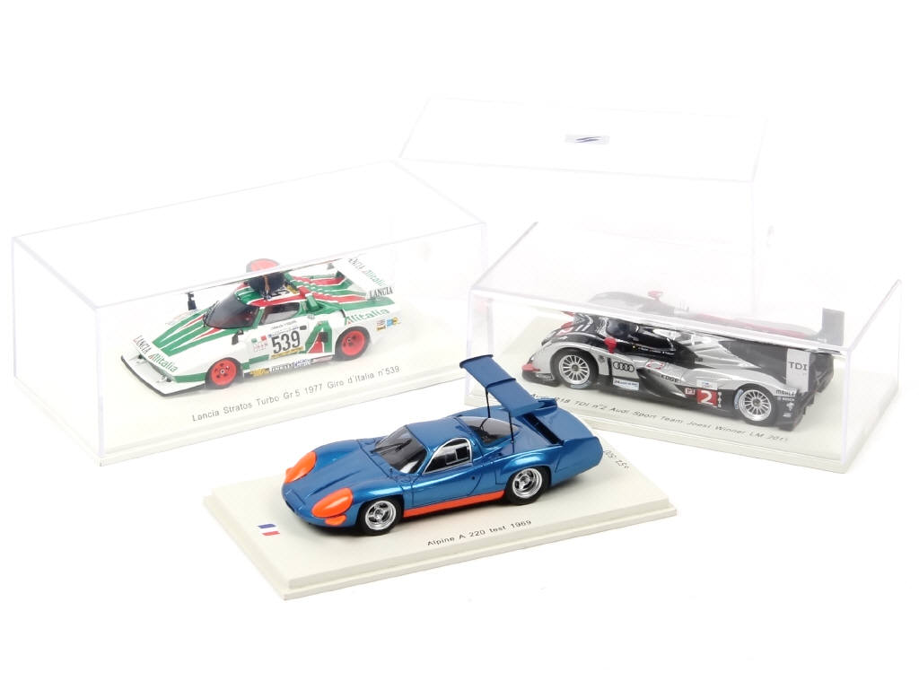 miniatures reproduisant les modèles : AUDI R18 Le Mans 2011, ALPINE A220 1969 & LANCIA STRATOS TURBO - sans suremballage