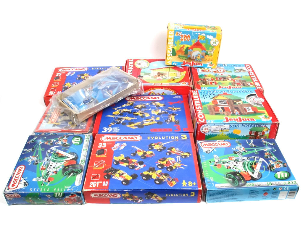 fabrication en plastique, métal & bois - on y retrouve les marques : JEUJURA & MECCANO - avec manques, parties cassées & déformations - les boîtes sont en états 'b' & 'e'