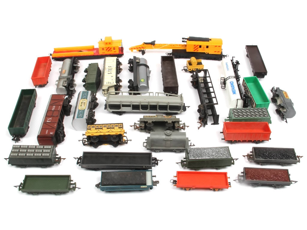 on y retrouve notamment les marques : MEHANO, JOUEF & TRIANG - avec manques & parties cassées - quelques traces d'humidité, d'oxydation & quelques modèles encrassés