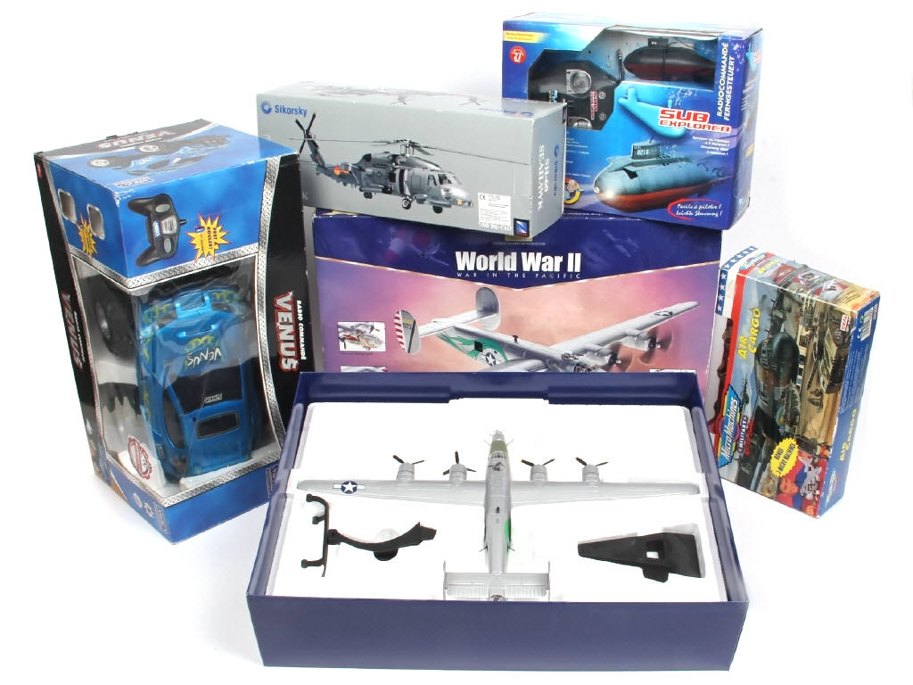 différentes échelles - comprend les modèles : SIKORSKY (avec pâles d'hélice cassées & recollées - traces de colle), CONSOLIDATED B-24J LIBERATOR 'THE DRAGON AND HIS TAIL' (une boite en état 'c'), sous-marins & 4 x 4 'VENUS' radio-télécommandés (non testés) - on y retrouve les marques : CORGI TOYS, NEW RAY,T2M & NIKKO (blister de boite perçé)