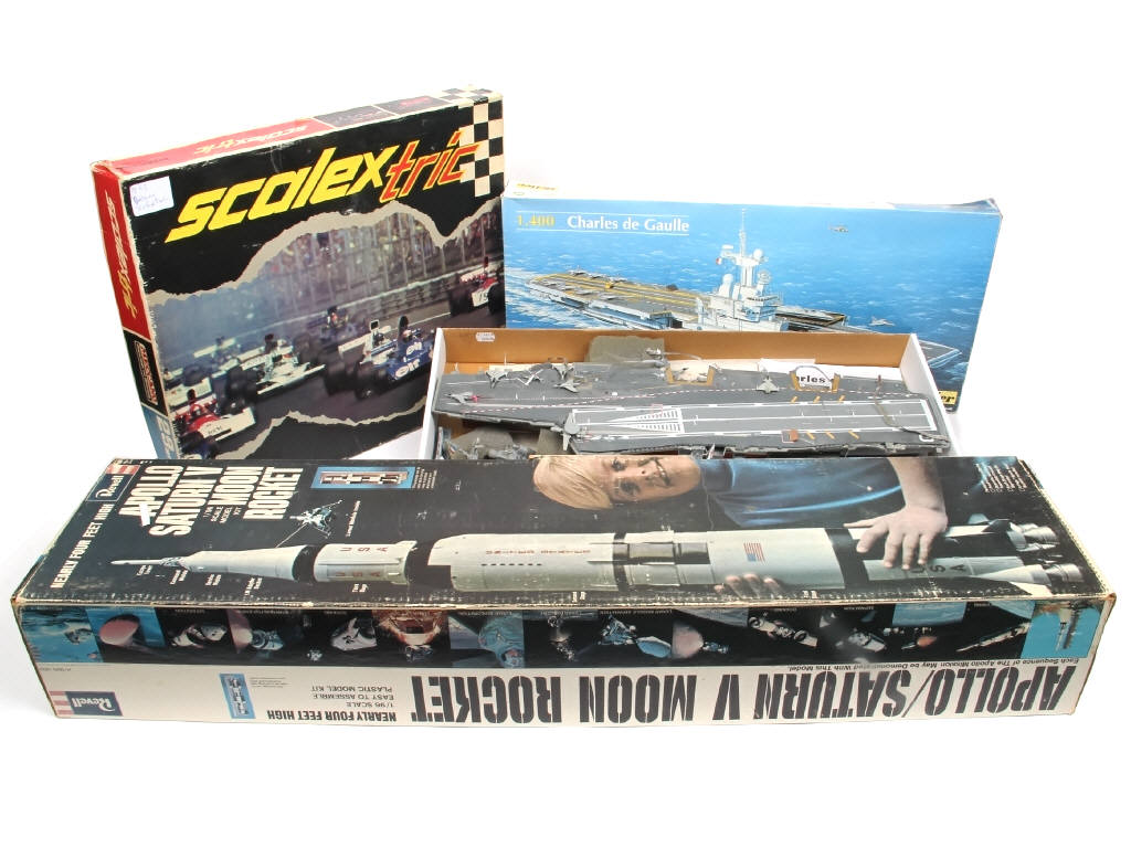 comprend : fusée APOLLO SATURN V, porte-avion CHARLES DE GAULLE & circuit électrique (non testé - dimensions : 53 x 45 x 8 cm - contient 2 voitures PORSCHE non conformes au coffret d'origine dont une avec optiques de phares manquants - 2 boitiers de commande, un transformateur, 2 rails droits, 8 rails courbes & un sachet d'accessoires) - on y retrouve les marques : SCALEXTRIC, HELLER & REVELL - avec manques & parties cassées - les boites sont en état 'c'