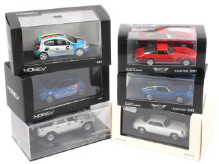 miniatures reproduisant les modèles : LAMBORGHINI, RENAULT, LANCIA (un optique de phare à repositionner, fêlures sur la boîte), ISO & SAAB - on y retrouve les marques : NOREV, MINICHAMPS & NEO