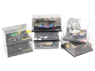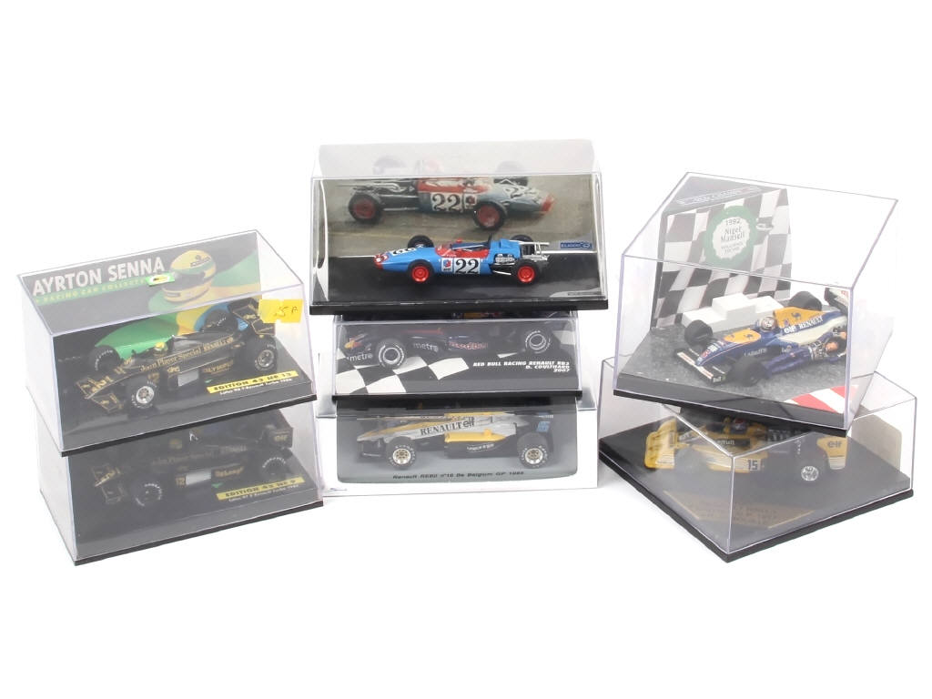 miniatures reproduisant les modèles : RENAULT, WILLIAMS, ALPINE, RED BULL RENAULT & LOTUS (2 exemplaires différents) - on y retrouve les marques : MINICHAMPS, ELIGOR, QUARTZO, LANG & SPARK