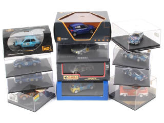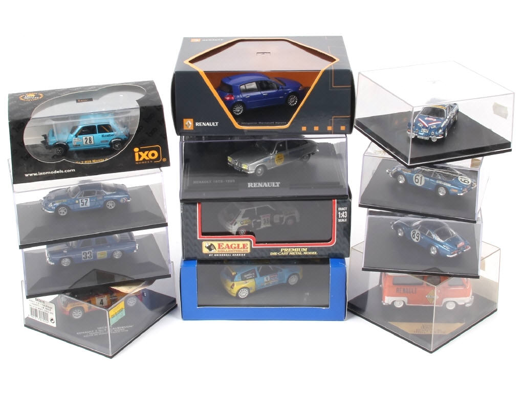 miniatures reproduisant les modèles : RENAULT (un exemplaire avec hayon en métal fatigue) & ALPINE - on y retrouve notamment les marques : EAGLE, ELIGOR, TROFEU, IXO, VITESSE & UNIVERSAL HOBBIES - manques certains suremballages