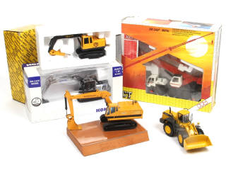 comprend notamment : PPM 530 ATT, pelle sur chenilles & chargeuse KOMATSU, CATERPILLAR (vissé sur socle en bois) & ATLAS COPCO ROC F7 perforatrice sur chenilles - on y retrouve notamment les marques : JOAL & STRENCO - 4 boites en 'b' & 'c' - un modèle sans