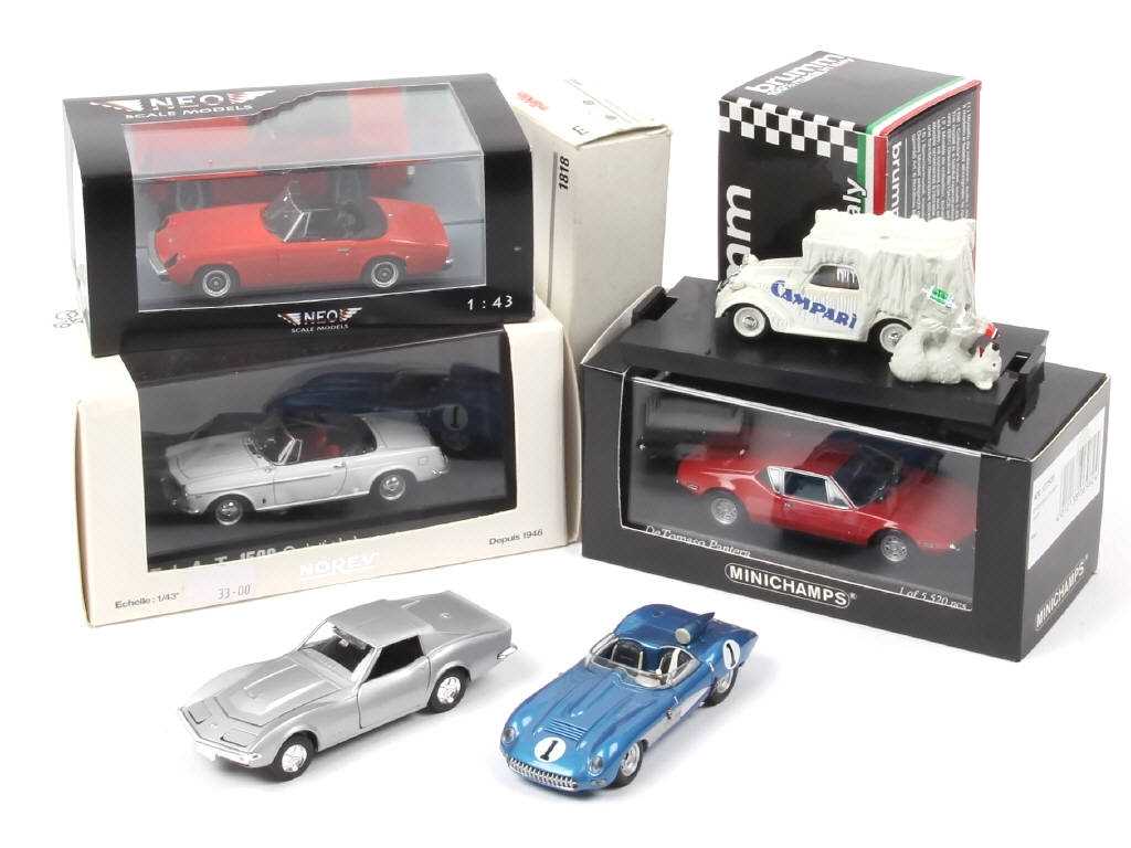 miniatures reproduisant les modèles : DE TOMASO, FIAT, JENSEN & CHEVROLET - on y retrouve les marques : MÄRKLIN (production récente), NEO, NOREV, BRUMM, AUTO ART (sans boîte) & MINICHAMPS - une boîte en état 'c'