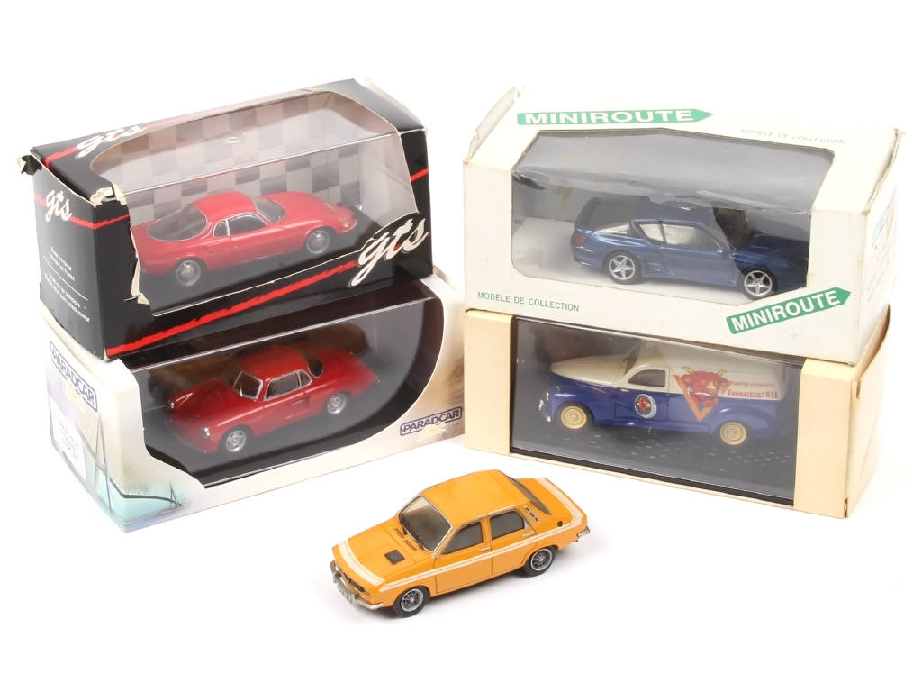 miniatures reproduisant les modèles : PEUGEOT (quelques manques sur les décalques), ALPINE (2 exemplaires différents), RENAULT & VP - on y retrouve notamment les marques : GTS, MINIROUTE, PARADCAR & AQUAVIT - les boîtes sont en états de 'b' à 'c' - un exemplaire sans boite