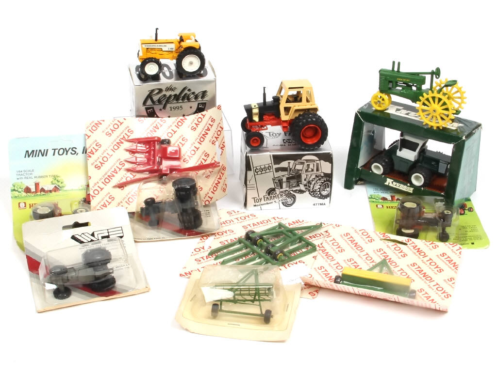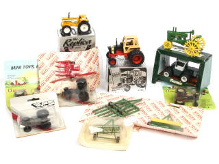 comprend notamment les modèles : MINNEAPOLIS-MOLINE, JOHN DEERE (sans boite), CASE, KNUDSON (une roue cassées à recoller) & HESSTON - on y retrouve notamment les marques : ERTL, MINI TOYS & STANDITOYS - quelques boites & supports cartonnés en état 'c' ou avec accrocs