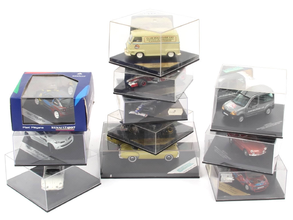 miniatures reproduisant les modèles : RENAULT (un exemplaire en état 'B' avec traces de métal fatigue & un autre promotionnel), ALPINE, WILLIAMS & LIGIER - on y joint une RENAULT FREGATE de la marque NOSLAGIE (boîte non d'origine) - quelques fêlures sur certaines boîtes