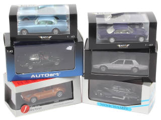 miniatures reproduisant les modèles : JAGUAR, ALVIS, ASTON MARTIN, NISSAN, ISO & OPEL - on y retrouve les marques : NEO, MINICHAMPS, J COLLECTION & AUTO ART - une fêlure sur une boîte
