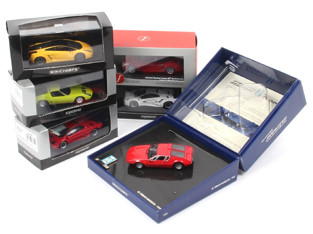 miniatures reproduisant les modèles : LAMBORGHINI (4 exemplaires différents dont un vendu en kiosque avec boîte non conforme & un autre en série limitée), NISSAN & DE TOMASO (série limitée) - on y retrouve notamment les marques : MINICHAMPS, J COLLECTION & KYOSHO - quelques frottements sur certaines boîtes