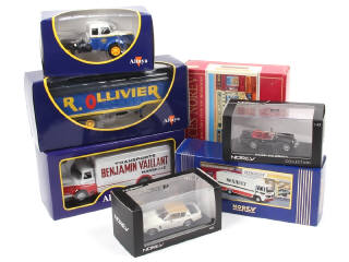 miniatures reproduisant les modèles : JENSEN, DAIMLER, UNIC, BERLIET & RENAULT - on y retrouve les marques : ALTAYA & NOREV - on y joint une façade de garage RENAULT de la marque NOREV