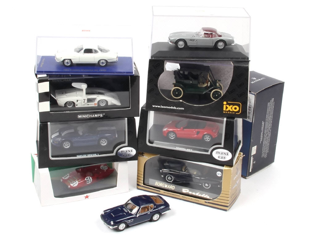 miniatures reproduisant les modèles : TOYOTA, SHELBY, NARDI (manque fixation de socle), BORGWARD, FORD, CHAPARRAL, BMW, MASERATI (sans boîte avec essuie-glaces cassés & manquants) & ALFA ROMEO - on y retrouve notamment les marques : M4, BIZARRE, MINICHAMPS & IXO - 2 exemplaires en séries limitées - quelques boîtes en état 'b' avec suremballages & certaines vis manquants