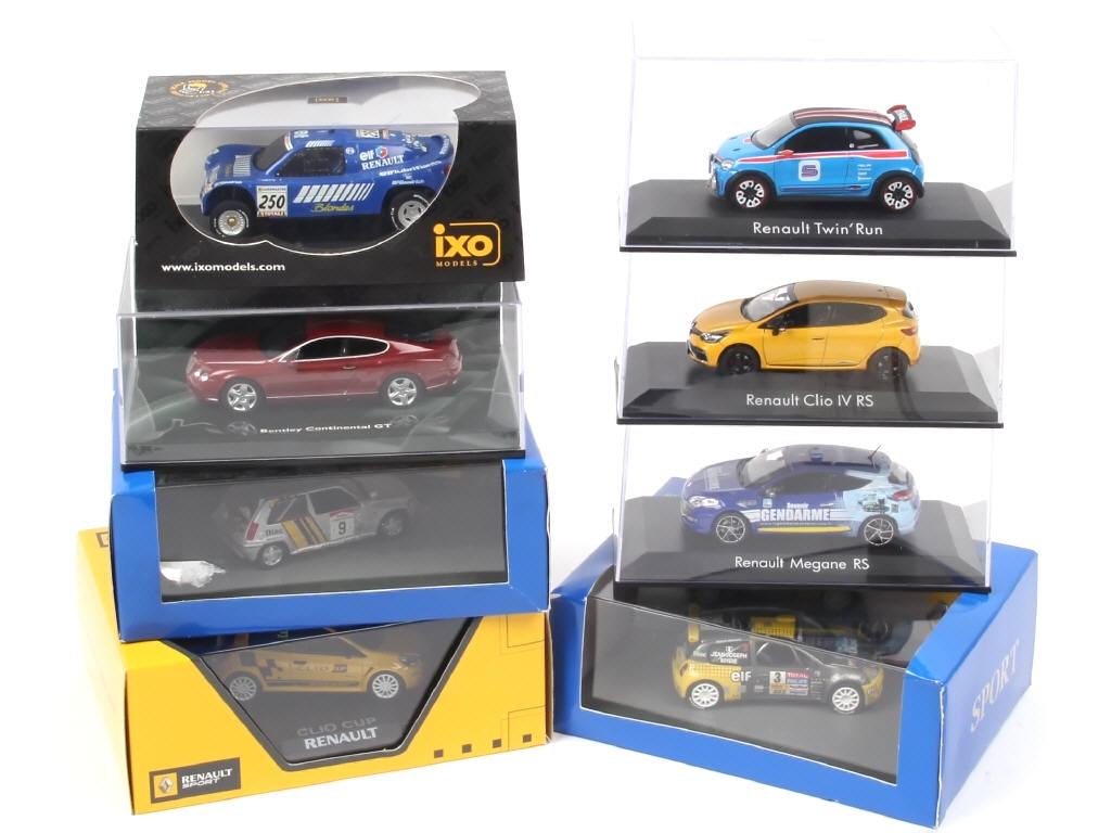 comprend les modèles : RENAULT CLIO, 5 GT, MEGANE, TWINGO & BENTLEY CONTINENTAL GT - on y retrouve les marques : MINICHAMPS, IXO, NOREV & UNIVERSAL HOBBIES - quelques accrocs sur certains suremballages