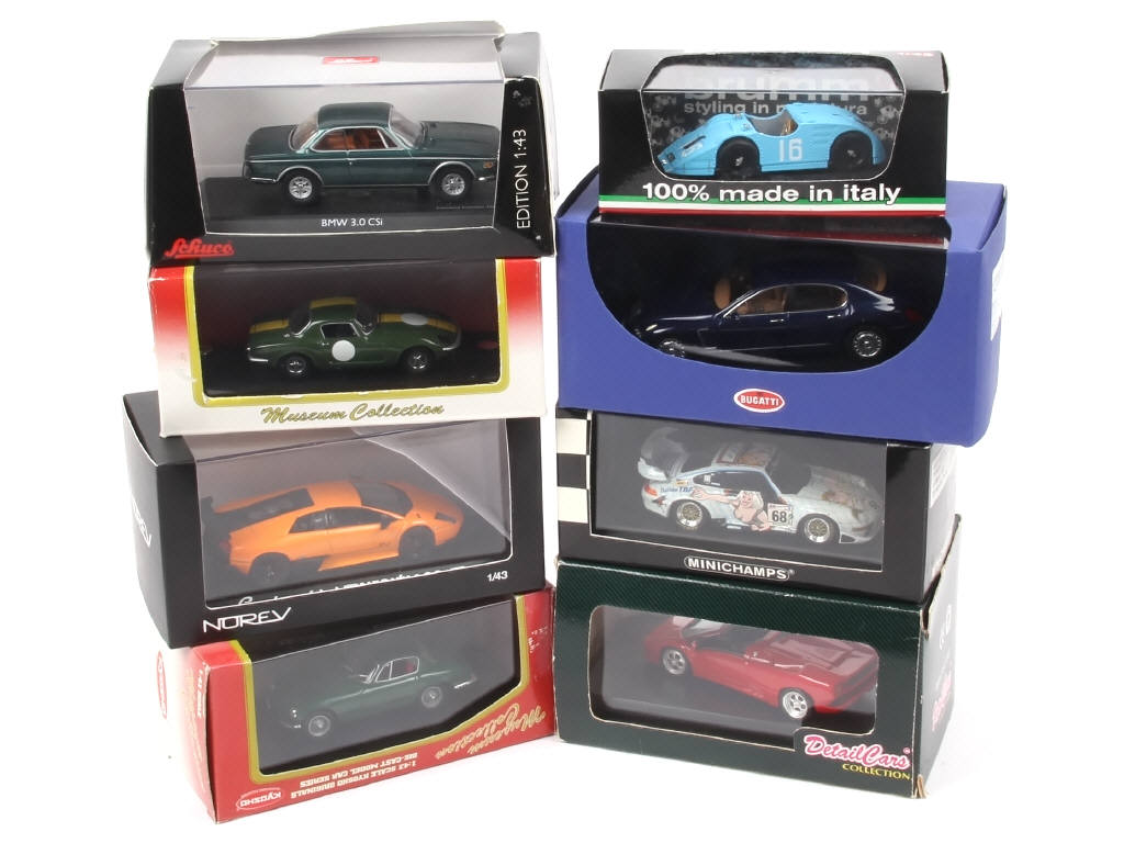 miniatures reproduisant les modèles : LOTUS (2 exemplaires différents), BMW, LAMBORGHINI (2 exemplaires différents), BUGATTI (2 exemplaires différents) & PORSCHE - on y retrouve les marques : BRUMM, KYOSHO, SCHUCO, NOREV, AUTO ART, MINICHAMPS & DETAIL CARS - quelques suremballages en état 'c'