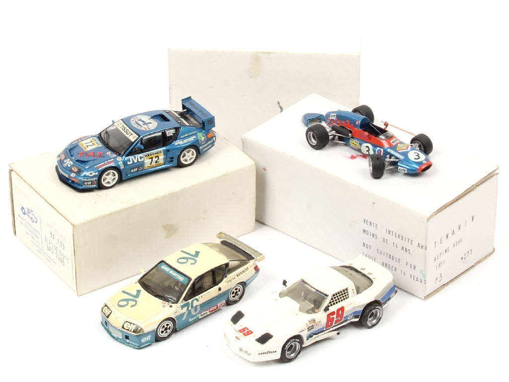 miniatures reproduisant les modèles : ALPINE RENAULT & CHEVROLET - on y retrouve notamment les marques : JPS & TENARIV - avec 3 boîtes (état 'b') - quelques petits accessoires manquants & cassés