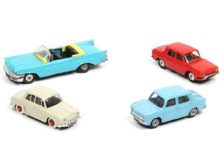 comprend : RENAULT 10 (manque une extrémité de pare-chocs avant), DAUPHINE, SIMCA 1000 & CHRYSLER NEWYORKER (pare-brise avec partie fondue & fêlure) - quelques parties ternies & manques de pellicule argentée - petites déformations sur 2 exemplaires