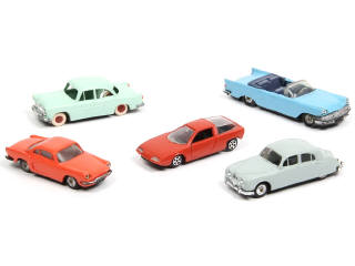 comprend : SIMCA ARIANE, JAGUAR 2L 400, RENAULT FLORIDE (vitrage opacifié), CITROEN GS CAMARGUE BERTONE & CHRYSLER NEWYORKER (petite décoloration de la carrosserie côté gauche) - quelques manques de pellicule argentée & déformations sur certaines carrosseries - quelques jantes légèrement fondues