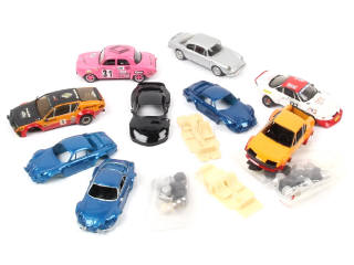 comprend les modèles : DAUPHINE & ALPINE (2 exemplaires différents) - on y retrouve notamment les marques : JPS & PARADCAR - on y joint 6 carrosseries (peintes), éléments & accessoires de différentes marques (avec certains accessoires manquants)