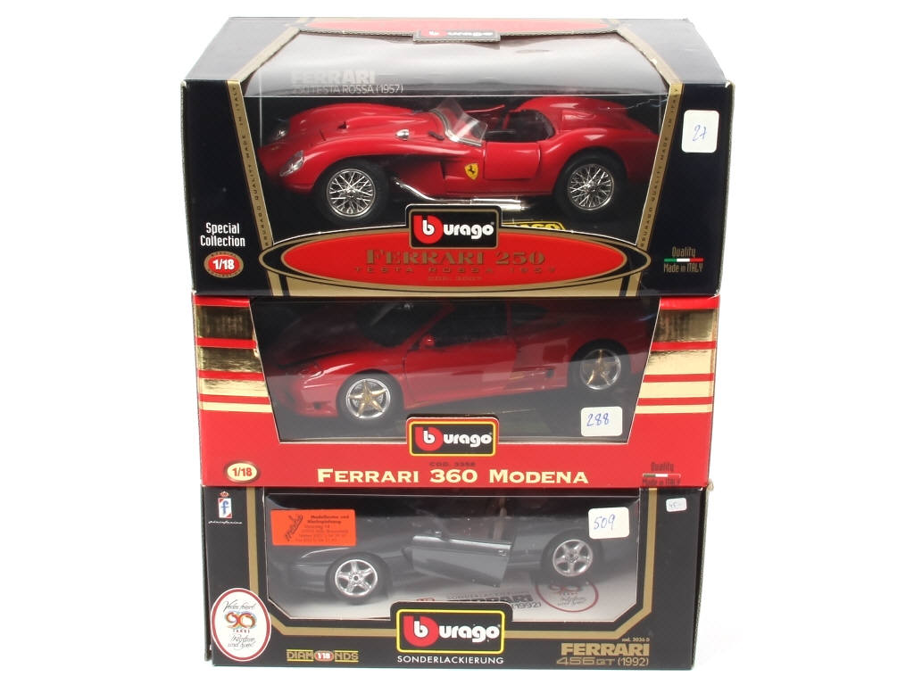 échelle 1/18ème - comprend les modèles : 456 GT, 360 MODENA & 250 (un papillon de roue incomplet) - transformations artisanales réalisées par une ou plusieurs entreprises en séries limitées (sur 2 exemplaires) - quelques accrocs sur les boîtes - BELLES REALISATIONS !