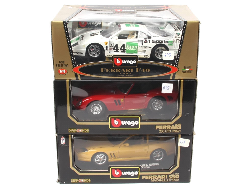 échelle 1/18ème - comprend les modèles : 250 GTO, F40 & 550 MARANELLO - transformations artisanales réalisées par une ou plusieurs entreprises en séries limitées (sur 2 exemplaires) - quelques accrocs sur les boîtes (une en état 'c') - BELLES REALISATIONS !