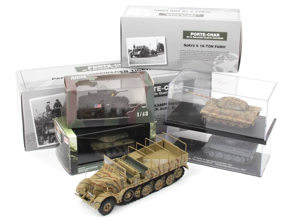 échelles différentes - comprend : SDKFZ 9 avec remorque, TIGRE I (2 exemplaires), II, STUAR M3 & M41 - on y retrouve notamment les marques : EDITIONS ATLAS & PROMODELS