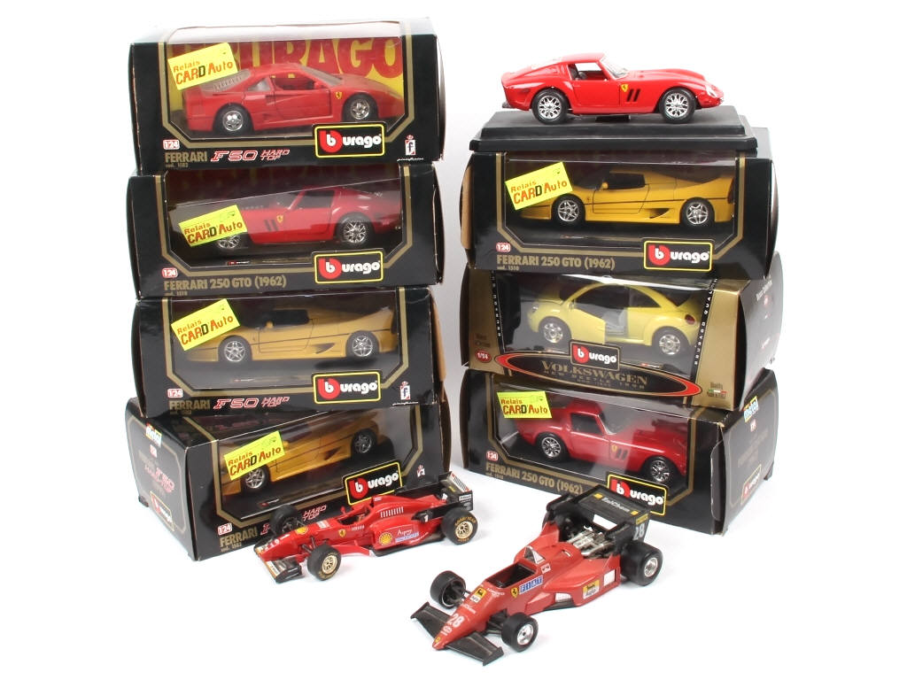 échelle 1/24ème - miniatures reproduisant les modèles : FERRARI (3 exemplaires sans boîte dont un avec une fixation de roue cassée) & VOLKSWAGEN - carrosseries plus ou moins encrassées - les boîtes sont en états de 'b' à 'c'