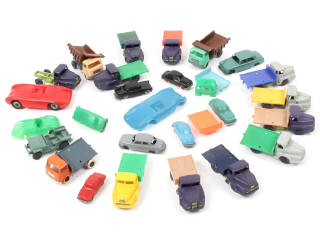 petites échelles - miniatures reproduisant notamment les modèles : UNIC, BERLIET, JEEP, PANHARD & SIMCA - on y retrouve notamment les marques : CLE & CADUM PAX - avec manques & parties cassées